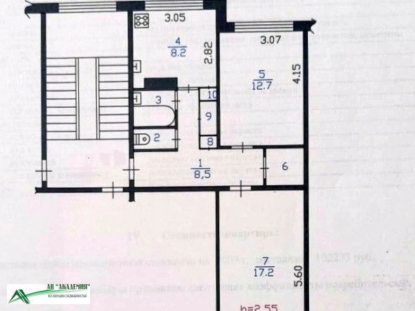 Площадь комнаты12,7 + 17,3